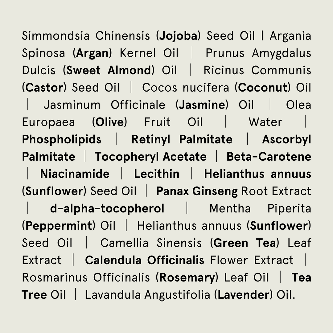 Ingredients: Simmondsia Chinensis (Jojoba) Seed Oil, Argania Spinosa (Argan) Kernel Oil, Prunus Amygdalus Dulcis (Sweet Almond) Oil, Ricinus Communis (Castor) Seed Oil, Cocos nucifera (Coconut) Oil, Jasminum Officinale (Jasmine) Oil, Olea Europaea (Olive) Fruit Oil, Water, Phospholipids, Retinyl Palmitate, Ascorbyl Palmitate, Tocopheryl Acetate, Beta-Carotene, Niacinamide, Lecithin, Helianthus annuus (Sunflower) Seed Oil, Panax Ginseng Root Extract, d-alpha-tocopherol, Mentha Piperita (Peppermint) Oil, Helianthus annuus (Sunflower) Seed Oil, Camellia Sinensis (Green Tea) Leaf Extract, Calendula Officinalis Flower Extract, Rosmarinus Officinalis (Rosemary) Leaf Oil, Tea Tree Oil, Lavandula Angustifolia (Lavender) Oil.